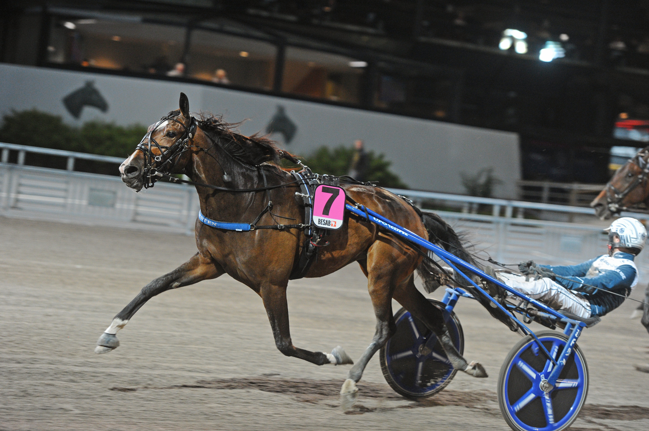 Daniel Wäjersten i ledningen med Miss Matters. Stallkamraten Gifted Kronos, i smått ivrig stil på utsidan för Magnus A Djuse.