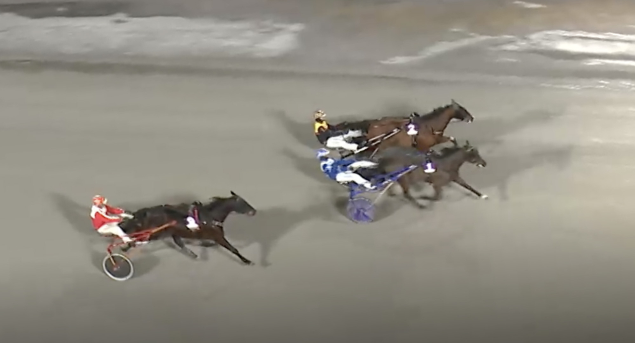Anna Näslund-tränade fyraåringen Global Festival speedade hem finalen av Umåkermästaren med sin gamle tränare och ägare Daniel Wäjersten i vagnen. Skärmbild ATG Live