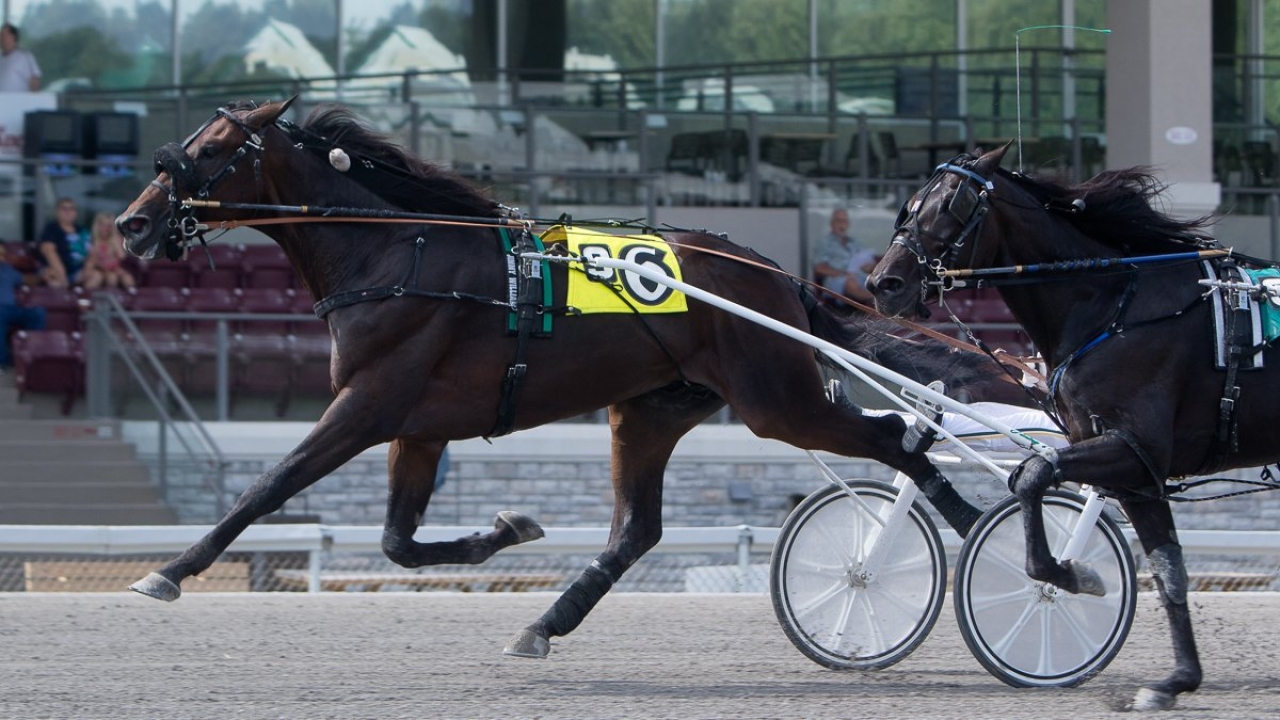 Jimmy William (6) vid sin spurtvinst i ett försök i Pennsylvania Sire Stakes. Foto Chris Gooden