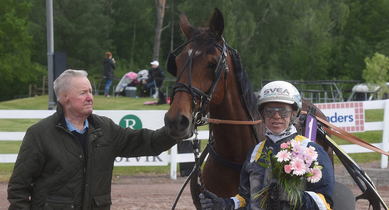 Arne Eriksson har gått bort. Här delar Arne ut pris i sitt eget lopp på Mantorptravet i juni, där Digital Track vann. Foto Magnus Strömsten/ALN