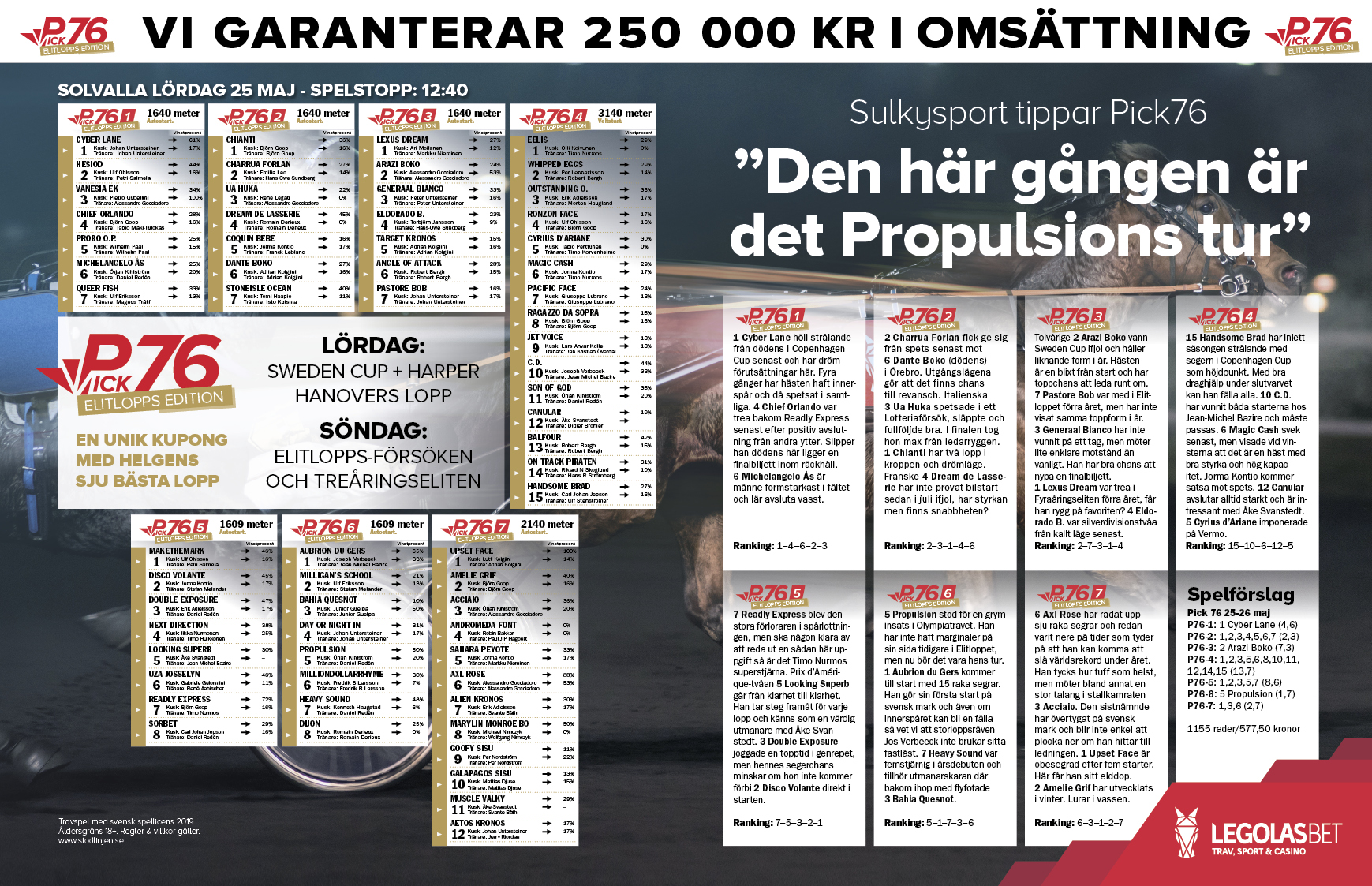 5 Propulsion stod för en grym insats i Olympiatravet. Han har inte haft marginaler på sin sida tidigare i Elitloppet, men nu bör det vara hans tur. 1 Aubrion du Gers kommer till start med 15 raka segrar. Han gör sin första start på svensk mark och även om innerspåret kan bli en fälla så vet vi att storloppsräven Jos Verbeeck inte brukar sitta fastlåst. 7 Heavy Sound var femstjärnig i årsdebuten och tillhör utmanarskaran där bakom ihop med flyfotade 3 Bahia Quesnot.